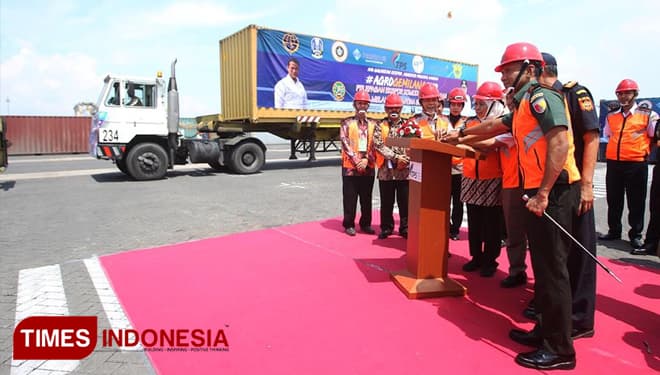 TIMES Jakarta/Gubernur Jawa Timur. Dra. Hj. Khofifah Indar Parawansa saat melepas ekspor komoditi pertanian di Terminal PetikEmas Surabaya (TPS). Kamis (21/3/2019). (FOTO: TIM Media For TIMES Indonesia)