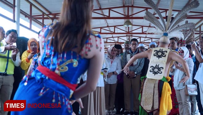 TIMES Jakarta/Cawapres Nomor urut 02, Sandiaga Salahuddin Uno disambut dengan upacara adat Tetek Pantan saat tiba di Bandara Tjilik Riwut Palangkaraya, Kalimantan, Senin (04/02/2019). (FOTO: Tofik For TIMES Indonesia)