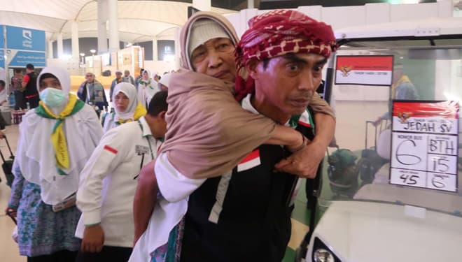 TIMES Jakarta/Petugas PPIH menggendong jemaah risti di bandara KAIA Jeddah, jelang pulang ke tanah air. (FOTO : istimewa).